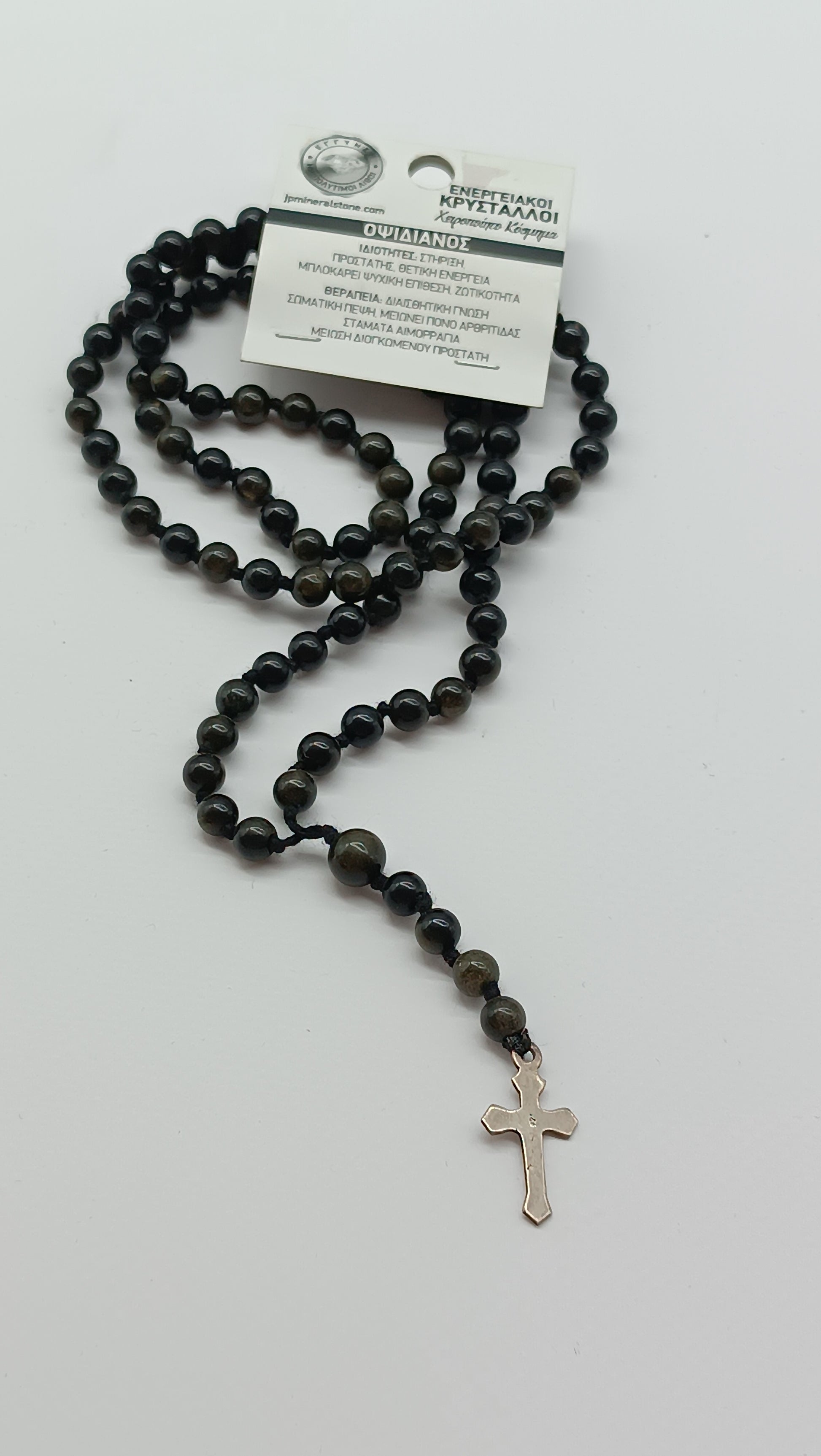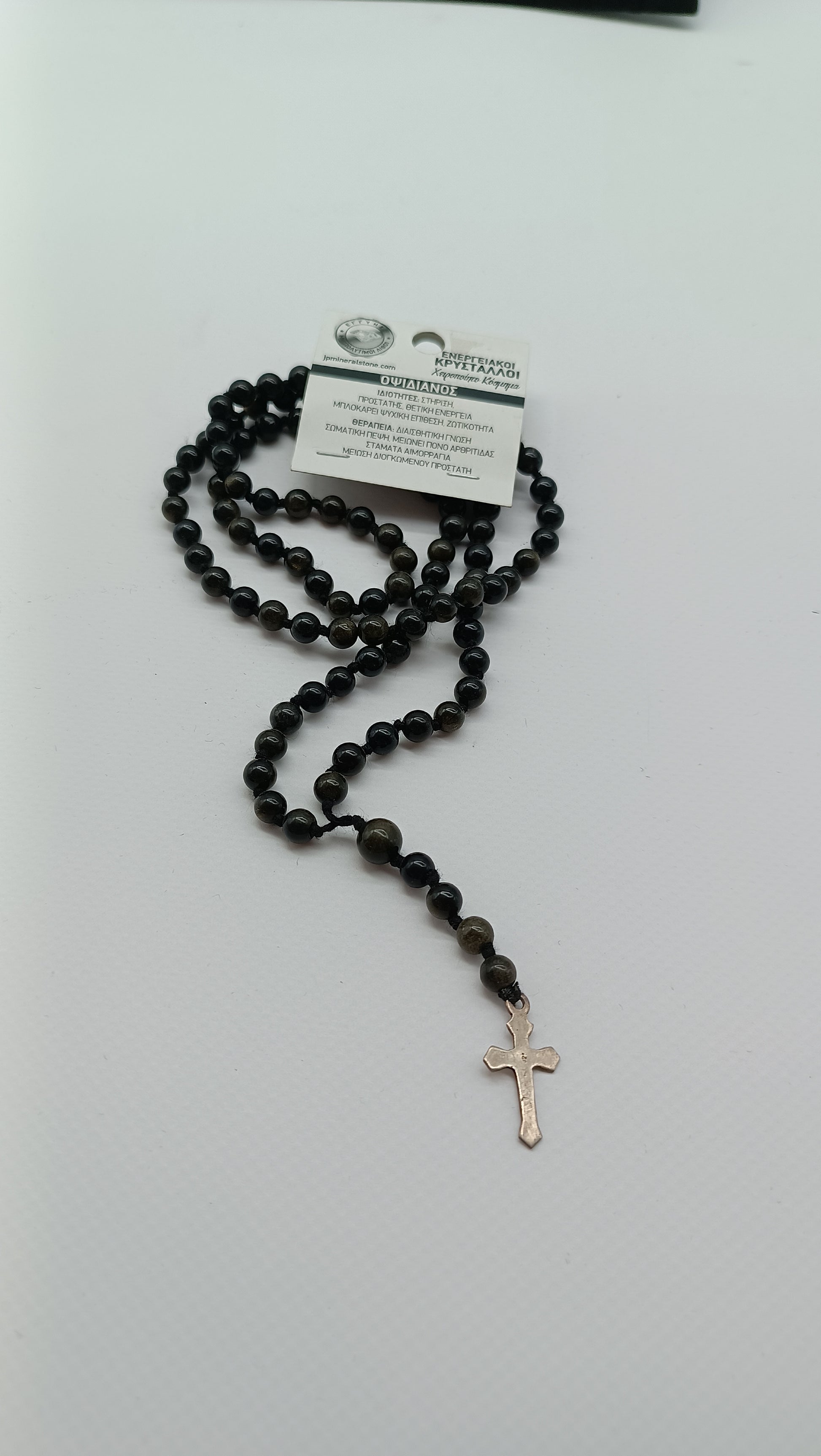 This handmade golden sheen obsidian rosary necklace features deep black gemstones with golden shimmer, carefully linked to form a flowing strand of prayer beads, finished with a shining silver cross.