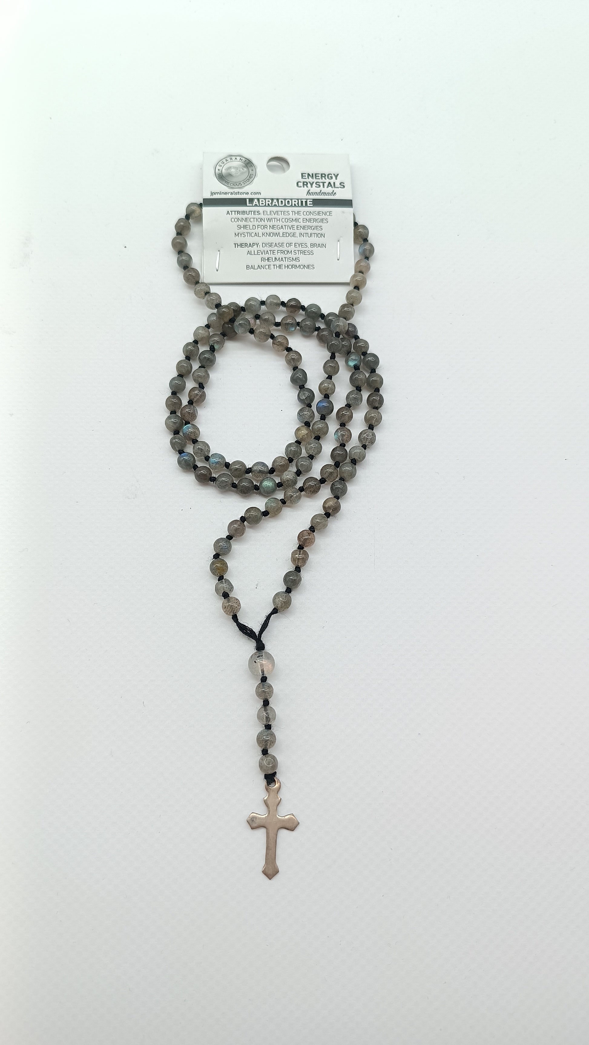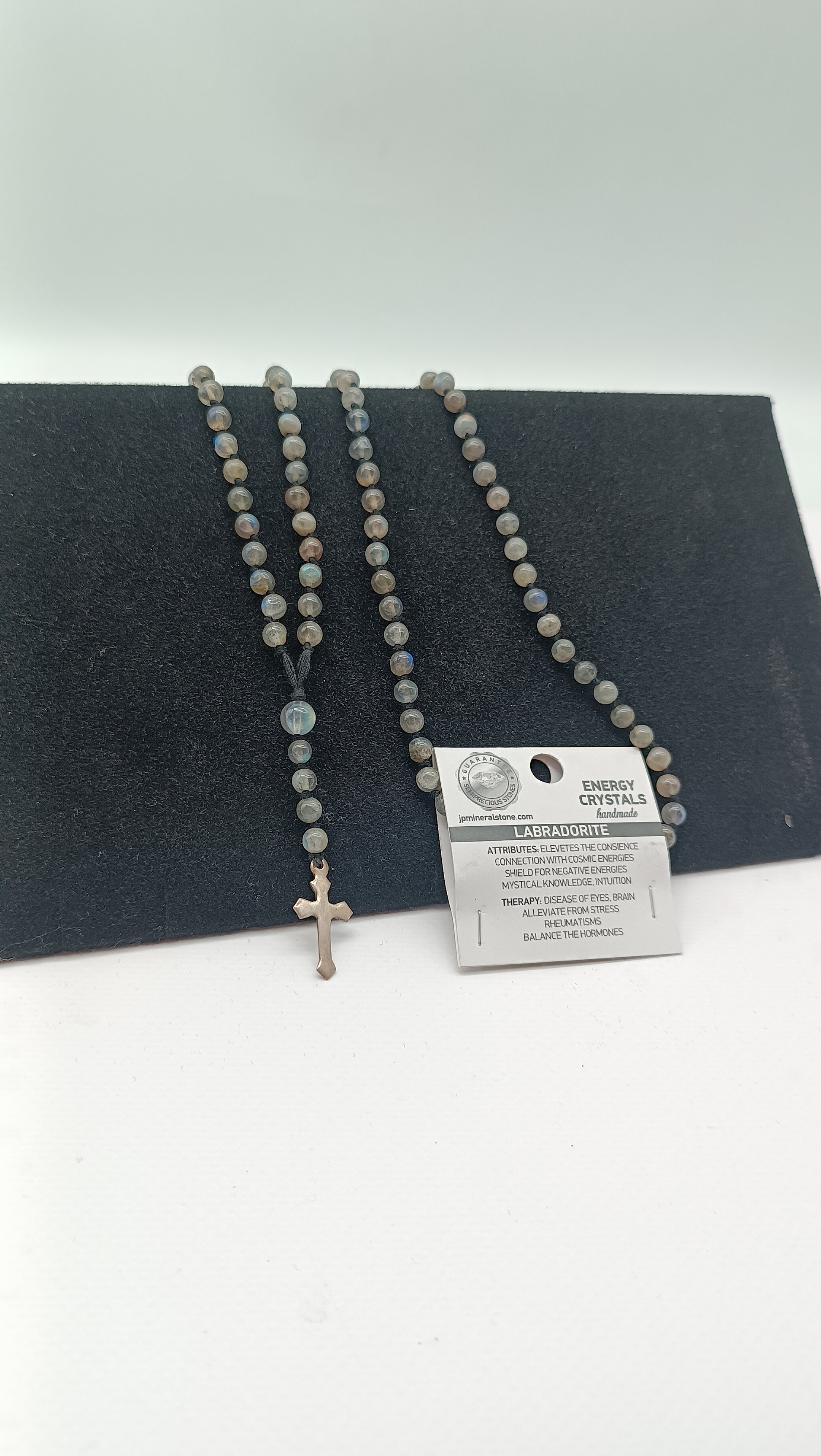 Rosenkranzperlen aus Labradoritkristall mit Medaillen-Kreuzstück aus 925er Sterlingsilber