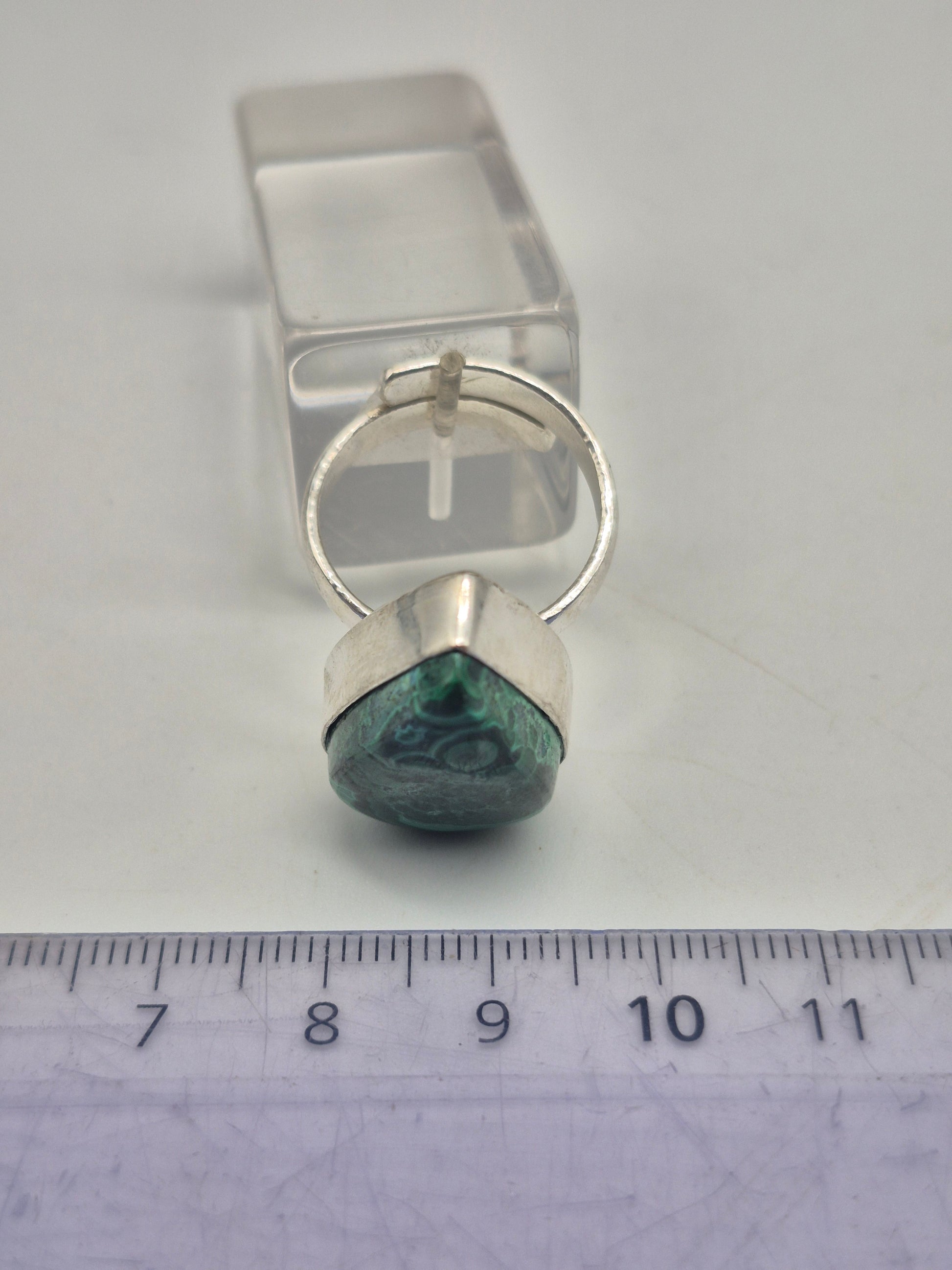 Bring vibrant energy into your style with this handcrafted Malachite adjustable ring, featuring a polished Malachite cabochon set in a shiny silver-plated bezel. The natural swirling green patterns of Malachite make each ring truly unique, while the adjustable band offers a comfortable fit for most sizes.