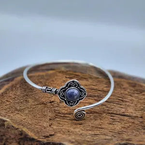 The adjustable open-cuff design ensures a comfortable fit for everyday wear. The rich blue hues of lapis lazuli, often flecked with golden pyrite, make it a striking statement piece that complements both casual and elegant outfits.