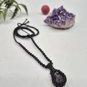 This stunning Black Tourmaline Macrame Necklace is more than just a beautiful piece of jewelry – it's a powerful symbol of protection and strength. Handcrafted with care, this necklace features a high-quality, polished black tourmaline stone, known for its grounding and protective properties. The stone is securely wrapped in intricate macrame knotting, creating a unique, bohemian-inspired design that complements any outfit.