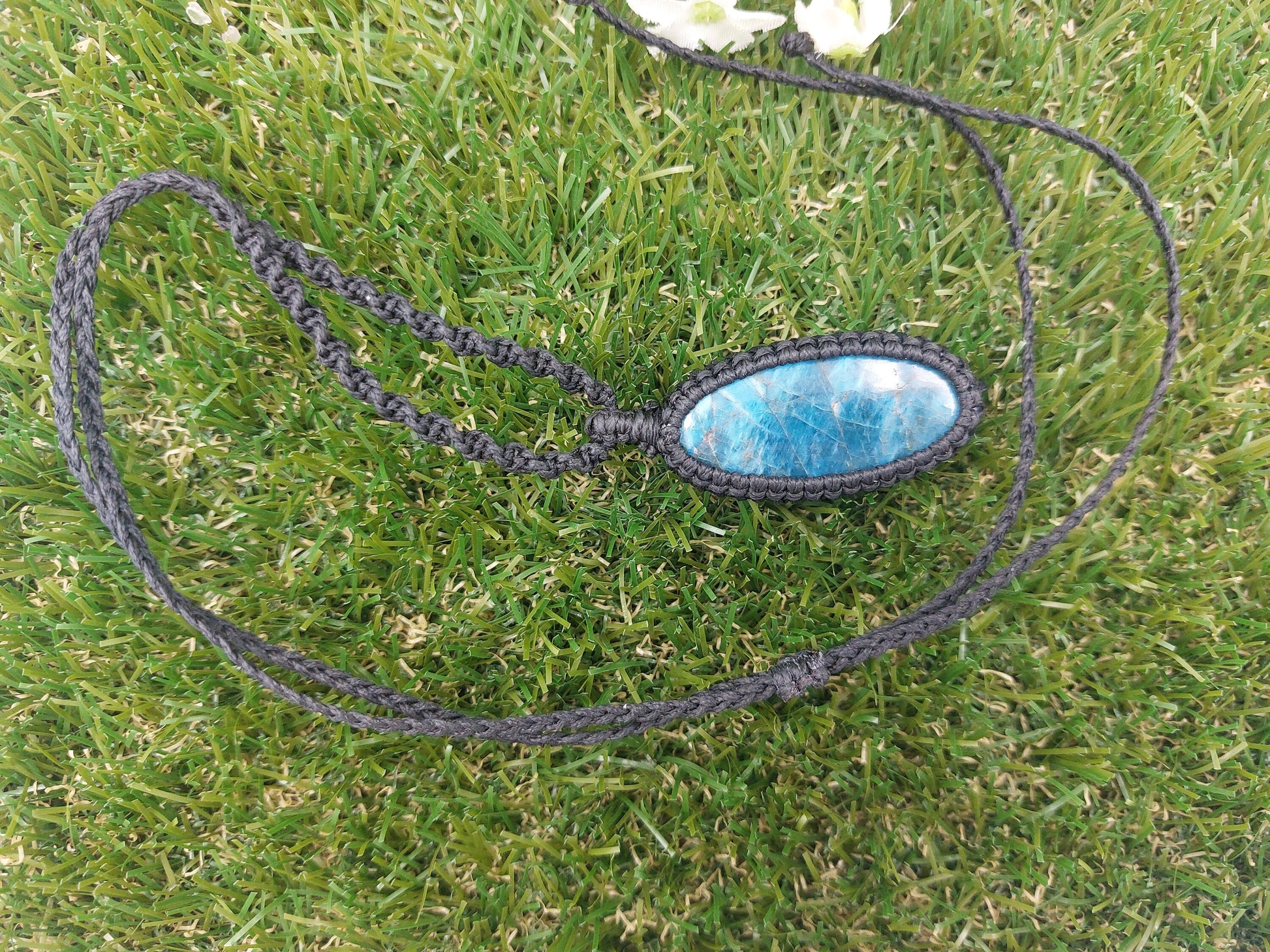 Blue Apatite Crystal Handmade Wrapped Macrame Necklace