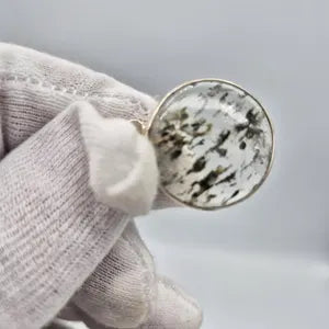 The combination of clear quartz and green tourmaline creates a beautiful contrast—clear brilliance with an earthy green accent. The cabochon cut enhances the natural clarity of the quartz while subtly showcasing the tourmaline within.