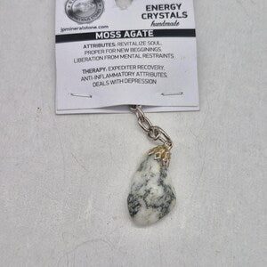 Moss agate is known for its grounding and growth-promoting energy, encouraging balance, emotional stability, and connection to nature. Handmade with care, this keychain is both functional and meaningful—perfect as a personal crystal accessory or a thoughtful gift.