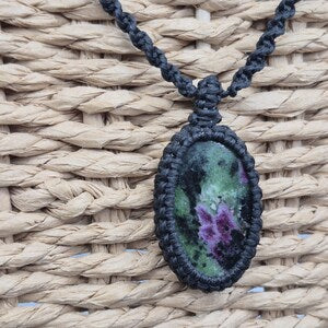 Awaken your passion and personal growth with this handmade Ruby Zoisite macramé pendant. Carefully knotted to highlight the natural combination of vibrant red Ruby and green Zoisite, each pendant is a unique work of art. Its rich colors carry the energy of courage, vitality, and transformation.