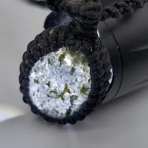 This stunning macrame pendant features a natural quartz crystal beautifully intertwined with green tourmaline, creating a piece that is as unique as it is powerful. Handcrafted with love, each pendant is designed to bring both beauty and energy to your jewelry collection.